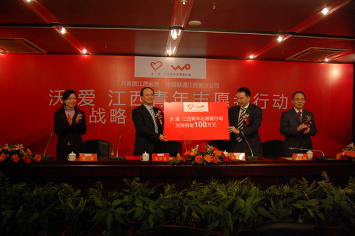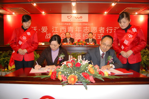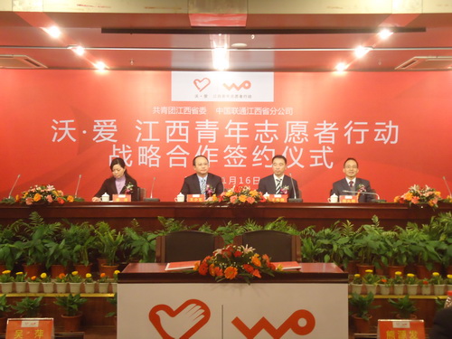2011年1月16日,“沃·爱 江西青年志愿者行动”战略合作签约仪式在南昌举行,团江西省委书记王少玄、中国联通江西省分公司总经理王竑弢,团省委副书记曾萍、中国联通江西省分公司副总经理程火明出席签约仪式,中国联通江西省分公司副总经理孙兵主持签约仪式。团省委、中国联通江西省分公司有关部门负责同志、青年志愿者代表近200参加了签约仪式。