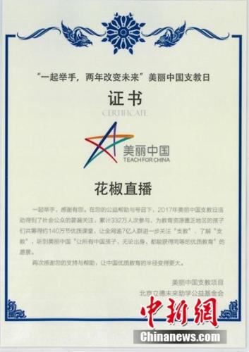 近日,花椒荣获了北京立德未来助学公益基金会颁发的美丽中国支教日荣誉证书,以表彰其在2017年美丽中国支教日“一起举手,两年改变未来”活动中做出的贡献。获奖之后,花椒负责人表示,将继续助力支教项目,为教育资源匮乏地区的孩子提供相关教学资助,努力让每个孩子都能享有公平而有质量的教育。